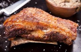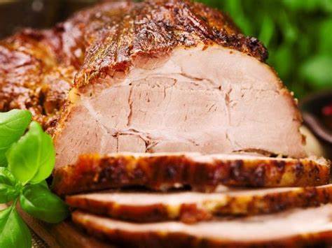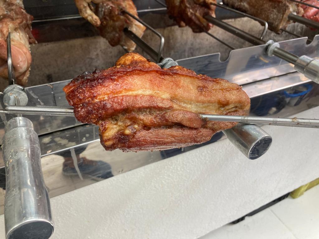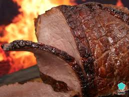 Delicioso pedaço de pernil de porco fatiado e assado na brasa.