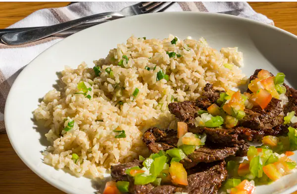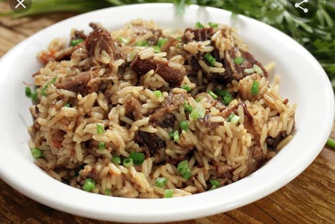 Delicioso arroz com costela de boi desfiada, servido com feijão, farofa, chips e salada.