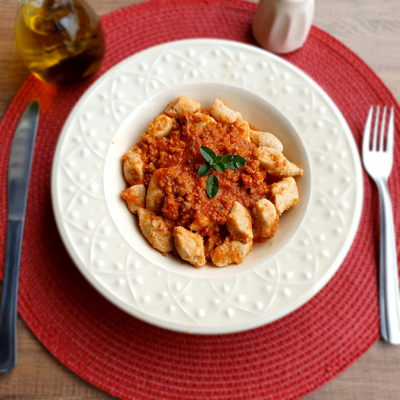 Delicioso nhoque da casa com molho funghi, servido com salada do dia.