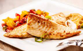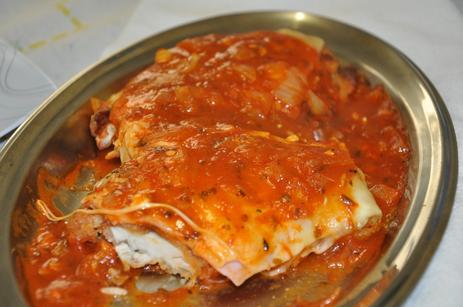 Filé de tilápia com molho de tomate, queijo e presunto, servido com arroz, feijão, farofa, chips e salada.