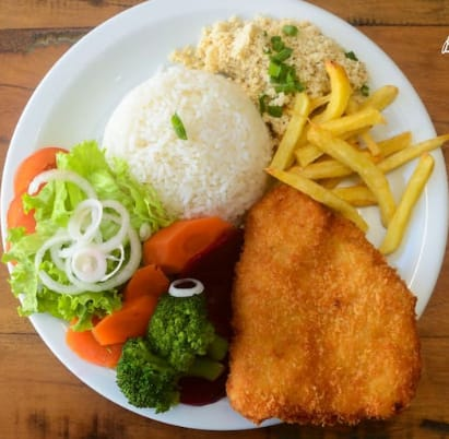 Delicioso filé de tilápia super crocante, servido com arroz, feijão, farofa, chips e salada.