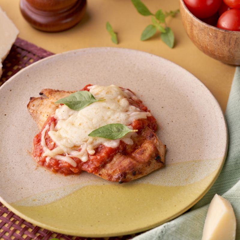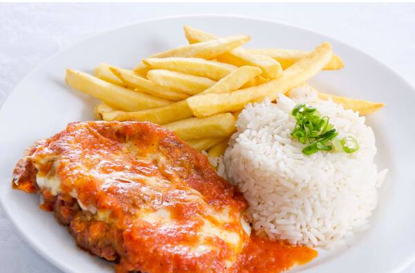 Suculento filé de peito de frango com molho de tomate, queijo e presunto, servido com arroz, feijão, farofa, chips e salada.