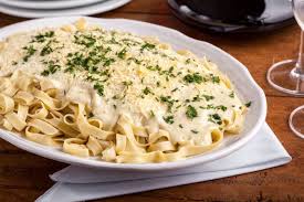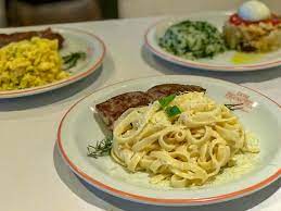 Delicioso bife de filé mignon, servido com fettuccine ao molho Alfredo e salada.