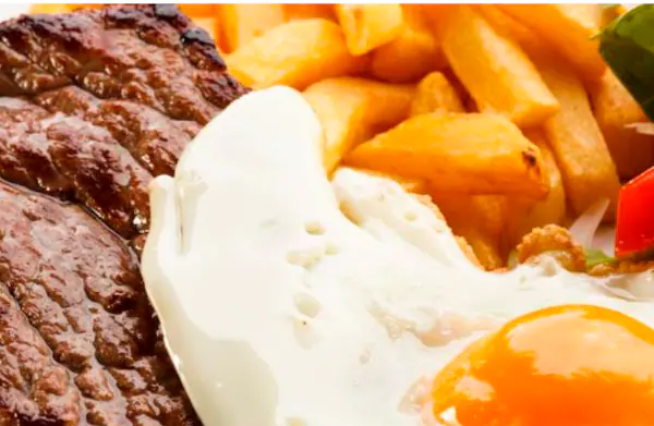 Delicioso bife de alcatra com um ovo estrelado, servido com arroz, feijão, farofa, chips e salada.