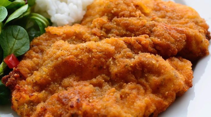 Filé de peito de frango super crocante, servido com arroz, feijão, farofa, chips e salada.