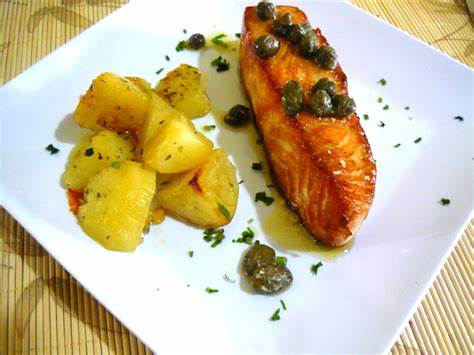 Deliciosa posta de salmão com molho de alcaparras, servido com arroz, feijão, farofa, batata rústica e salada.