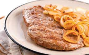 Bife de pernil acebolado, servido com arroz, feijão, farofa, chips e salada.