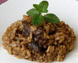 Delicioso e suculento risoto de cogumelos secos, servido com chips e salada.
