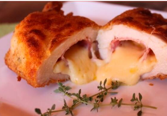 Delicioso filé de peito de frango recheado com presunto e queijo., servido com arroz, feijão, farofa, chips e salada.
